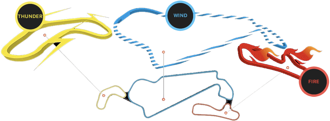This circuit runs clockwise and has the total length of 3.5 KM. The maximum height difference could reach nearly 5 stories high and has a total of 23 curves, including 9 left curves and 14 right curves. There are also high-speed, mid-speed and low-speed curves and a straight lane of nearly 1 KM, challenging the capacity of the racers and the specs of their cars.